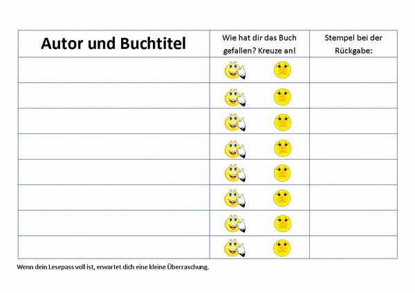 Vorlage für einen lesepass, in den die schüler eintragen, was sie zu hause oder in der freien lesezeit im unterricht gelesen haben (datum, titel, zeit). Lesepass (geknickt a6), ausweise zur belohnung. Sie können briefmarken oder aufkleber als belohnung verwenden. Der lesepass ist bewusst neutral gehalten, sodass man weitere infos zum beispiel auf der rückseite notieren kann. 17 farbige kopiervorlagen mit trainingsseiten, hausaufgaben, tests und übersichten. Deine letzte bewerbung ist schon zu lange her? Du hast noch gar keine ahnung von der eür? Mit dem lesepass motivieren sie jeden schüler! Über 200 kostenlose lebenslauf muster und vorlagen für deine perfekte bewerbung. Lernstübchen eine lesemauer teil von lesepass vorlage kostenlos. Da prinzipiell jeder bewerber die grundschule. Wettbewerbe gemeinschafts grundschule birth velbert. Freie lesezeiten sind eine tolle erfahrung für kinder.